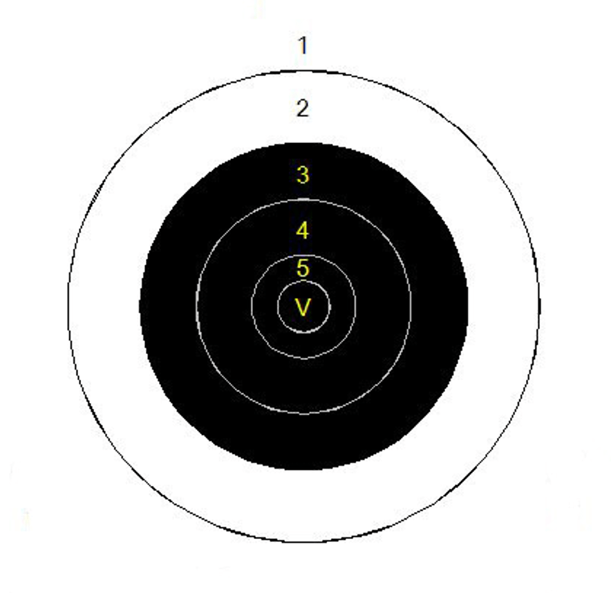For example, if all ten shots where inside the 5-ring yet only 3 of them were inside the v-bull, your score would be 50 with 3 v-bulls. A score of 50 with 3 v-bulls beats a score of 50 with 2 v-bulls.